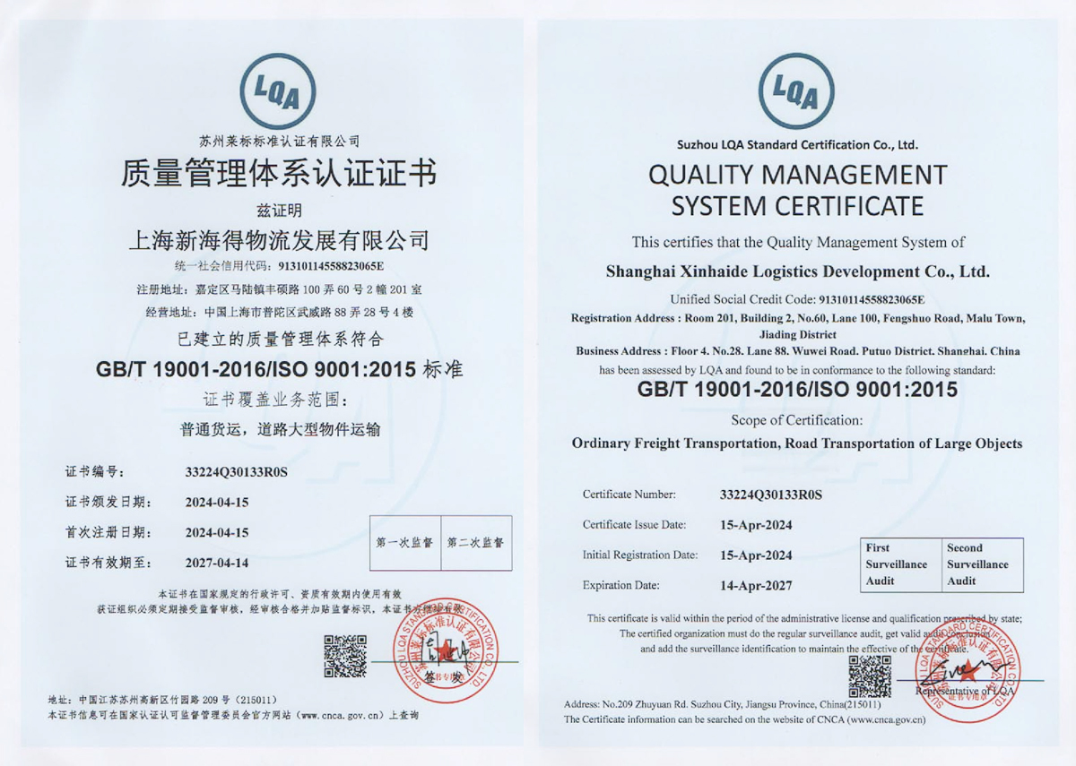 新海得物流嚴格按現(xiàn)代物流操作流程進行標準化運作。已通過國際質(zhì)量管理體系ISO9001:2015體系認證。運用健全的客戶服務管理系統(tǒng)、車輛管理系統(tǒng),財務管理系統(tǒng)。在查詢、監(jiān)控、追蹤、結(jié)算等方面與客戶做到無縫對接,打造了專業(yè)高效的客戶服務體系。
